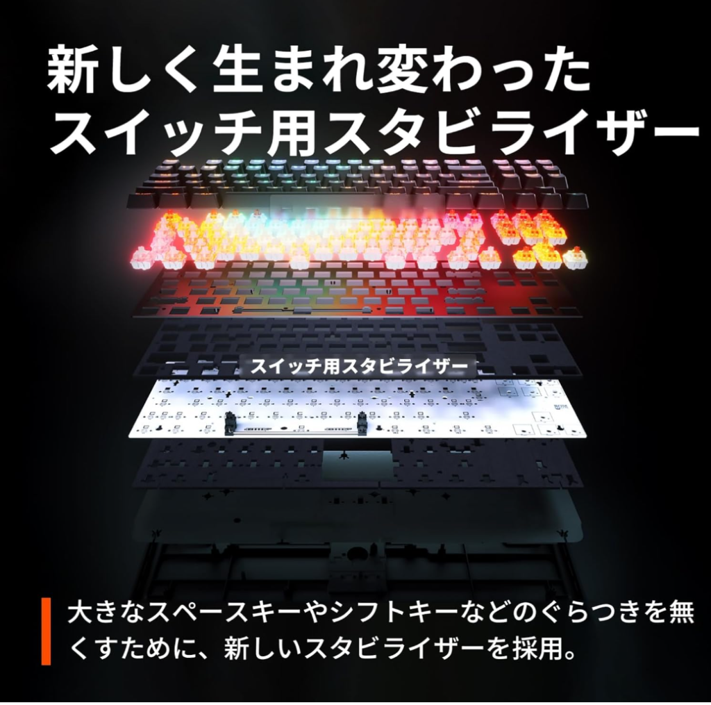 OmniPoint3.0とは、キーボードのぐらつきを抑えるために、新しく採用されたキーボードのスタビライザー。いわゆる基盤です。筆者はApex Pro TKL (2023) を使用していますが、確かに、スペースキーなどの、多少のぐらつきは少し気になることがあります。ですが、普段ゲームをプレイしている分には特に不自由を感じないので、OmniPoint3.0以外に性能に差が無いApex Pro TKL (2023) は、ゲームにかなり適したキーボードであるといえます。